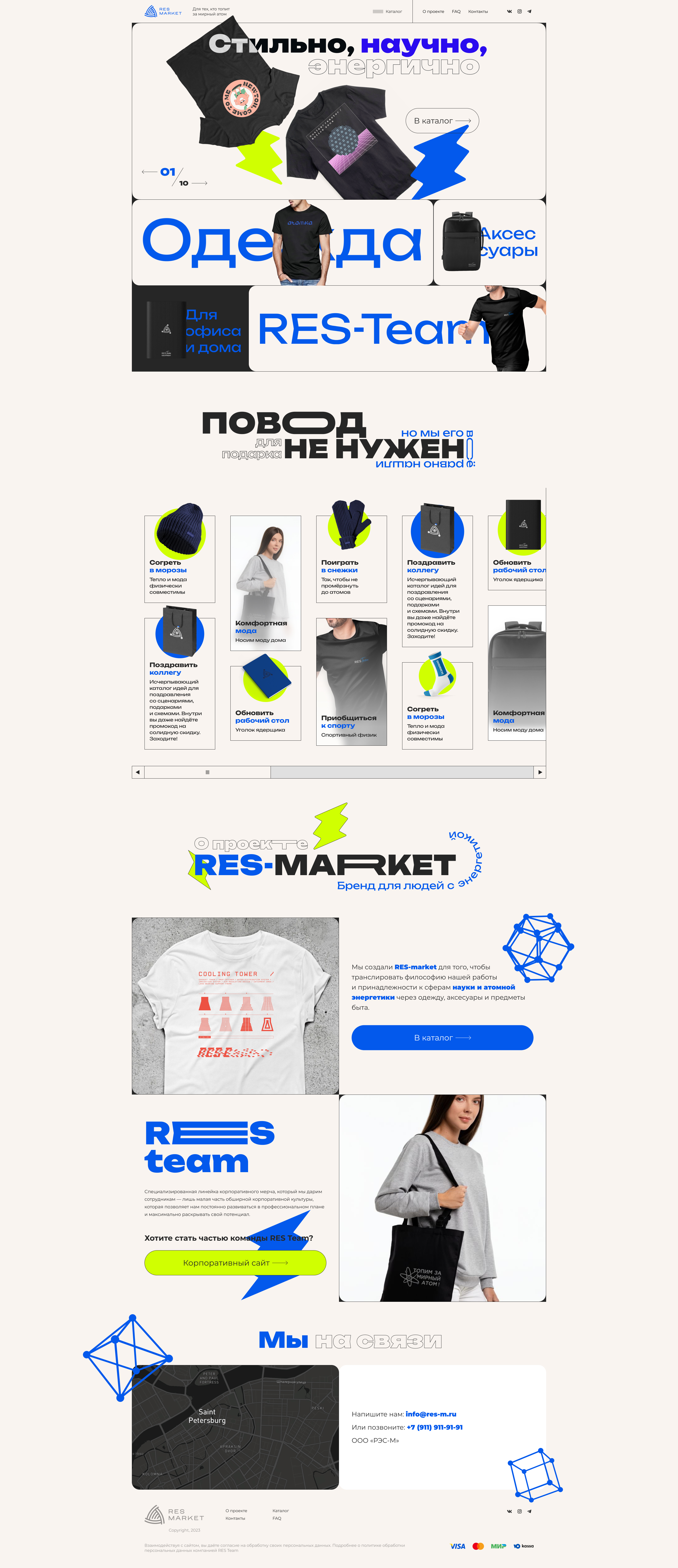 «Ресмаркет» — фирменный производитель и продавец стильной одежды с научной тематикой. Для главной страницы требовался яркий и стильный визуальный прием. Вот что из этого вышло: